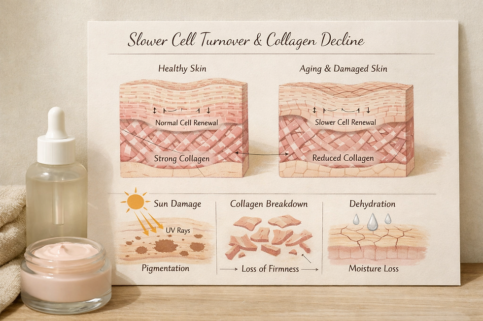 Hormonal shifts reduce oil production and slow repair, making barrier support and hydration even more important.
